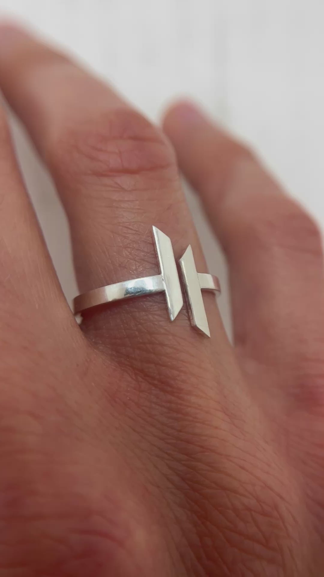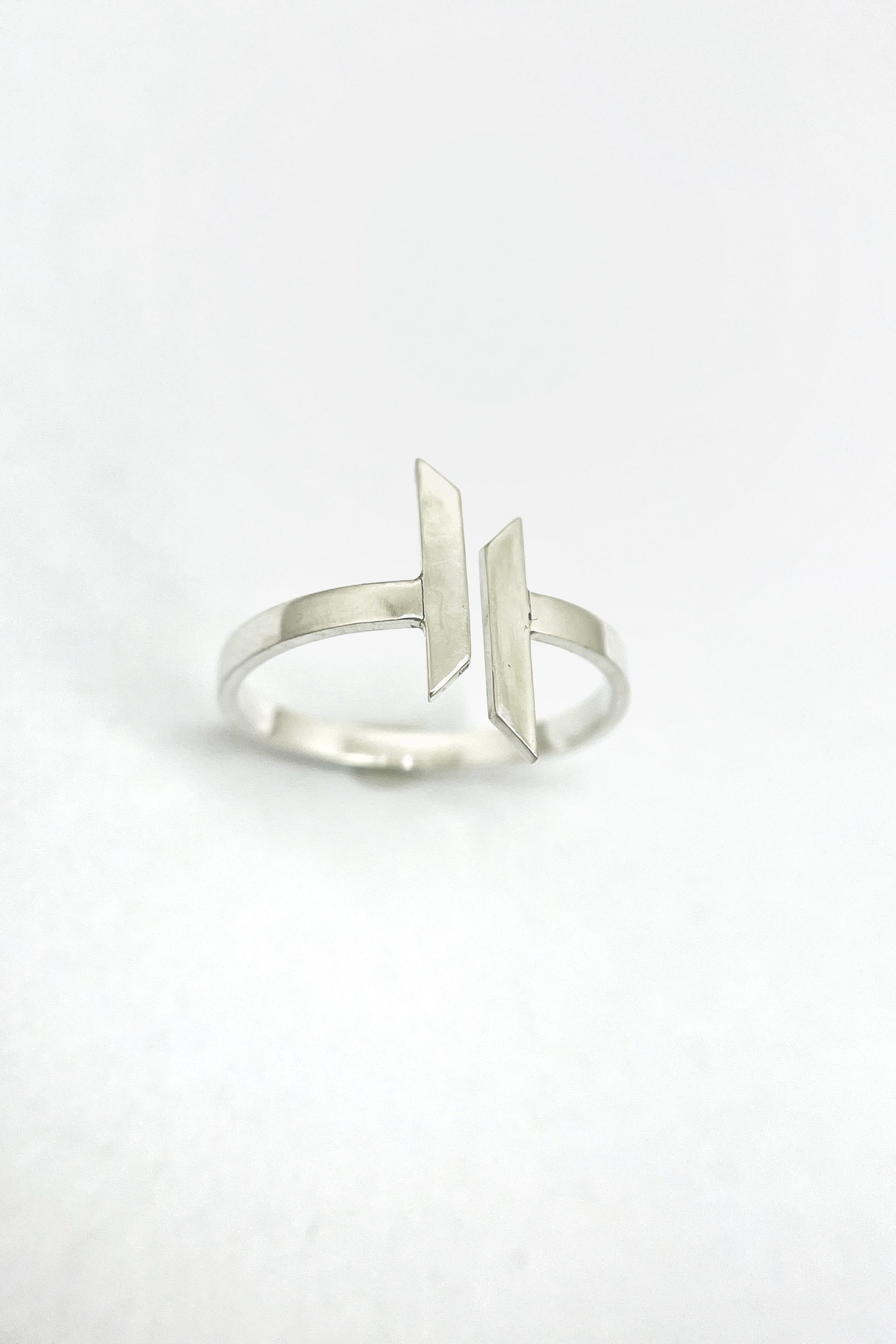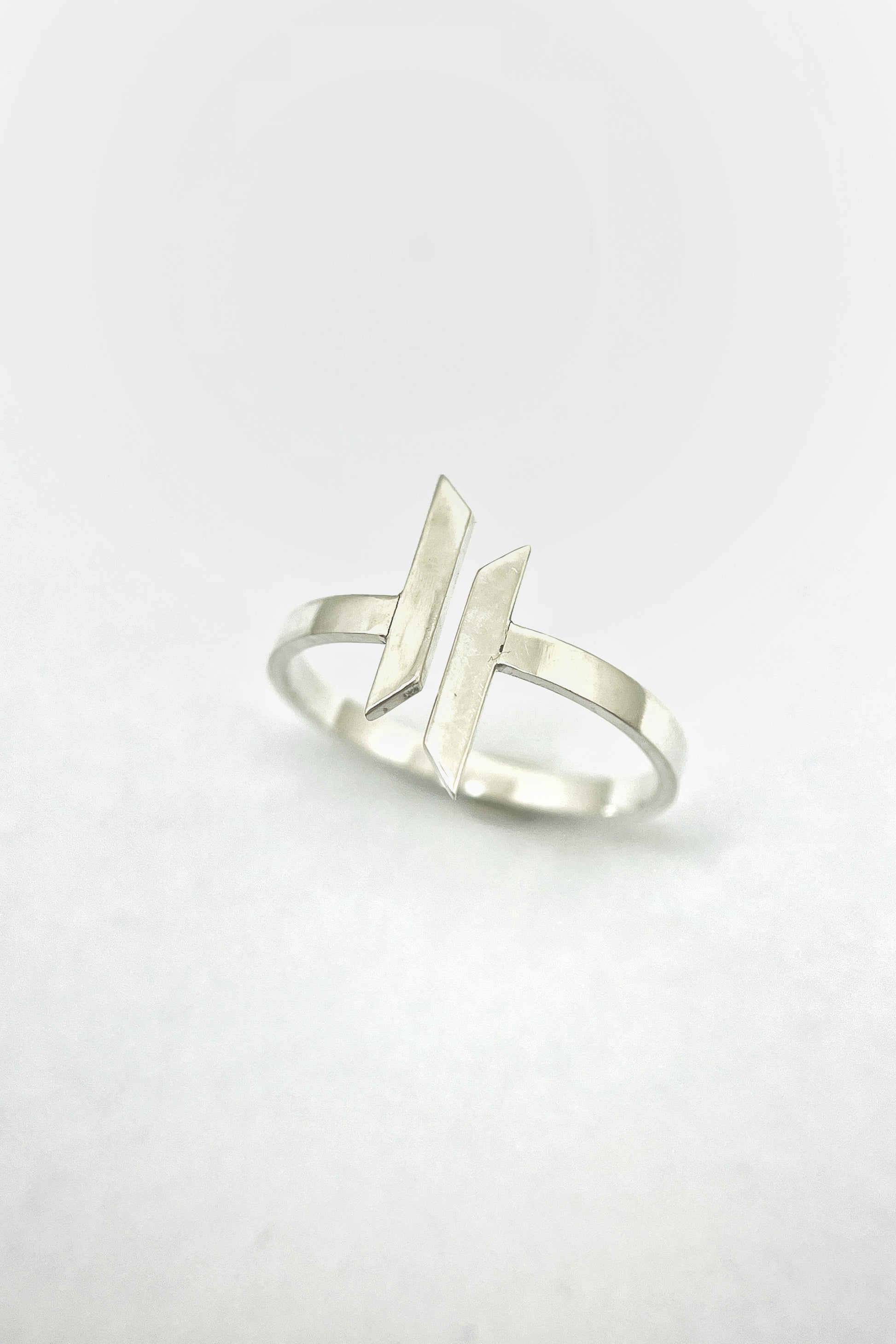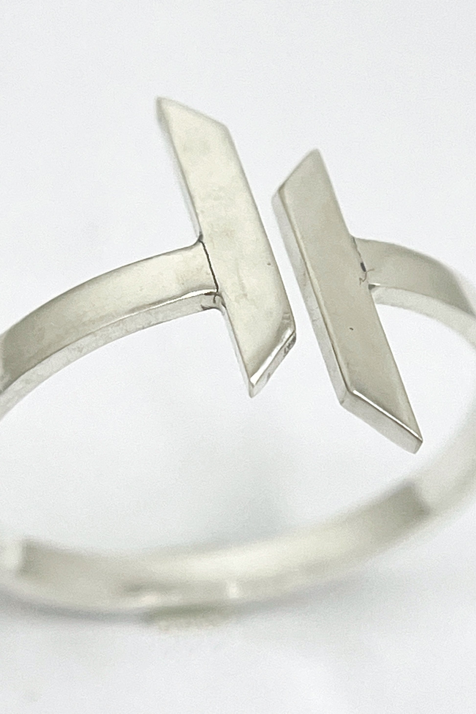 A sterling silver open ring featuring offset trapezoid-shaped bars. The geometric design leaves a slim opening between the shapes, giving the piece an edgy, modern look. The open style also allows for slight adjustability in size.