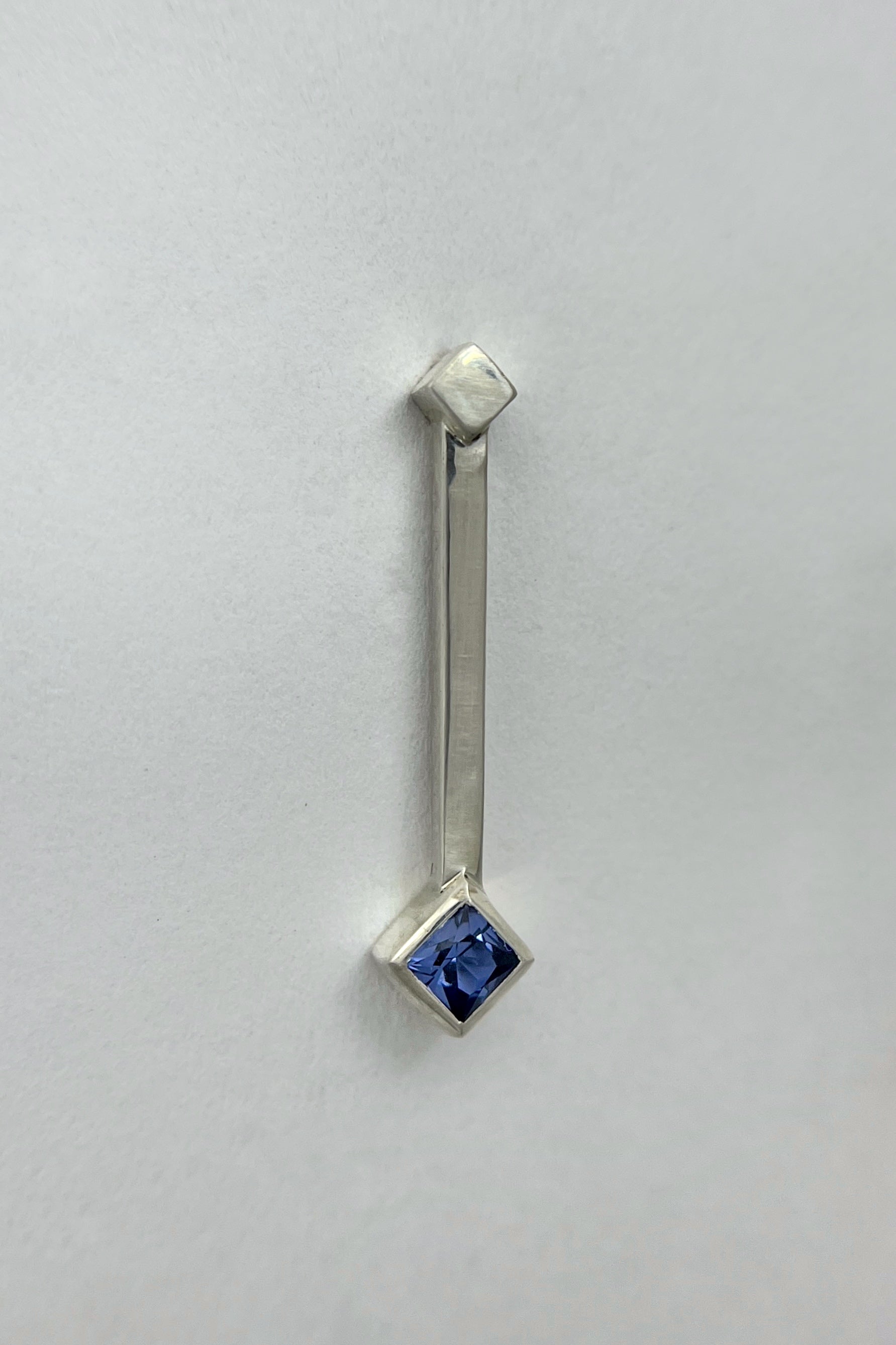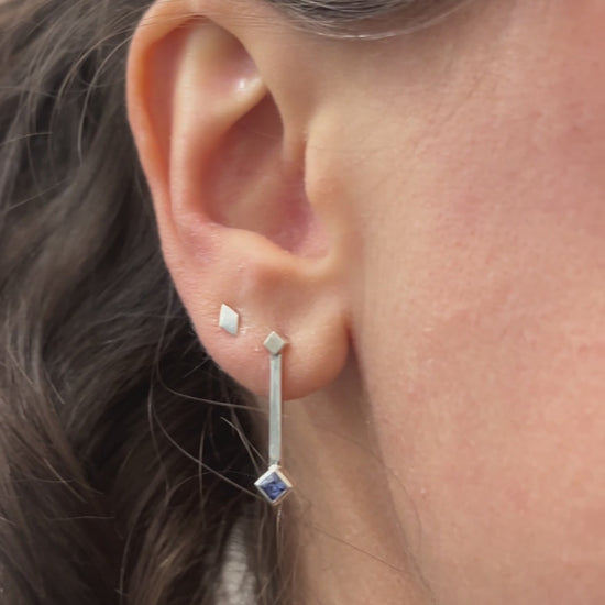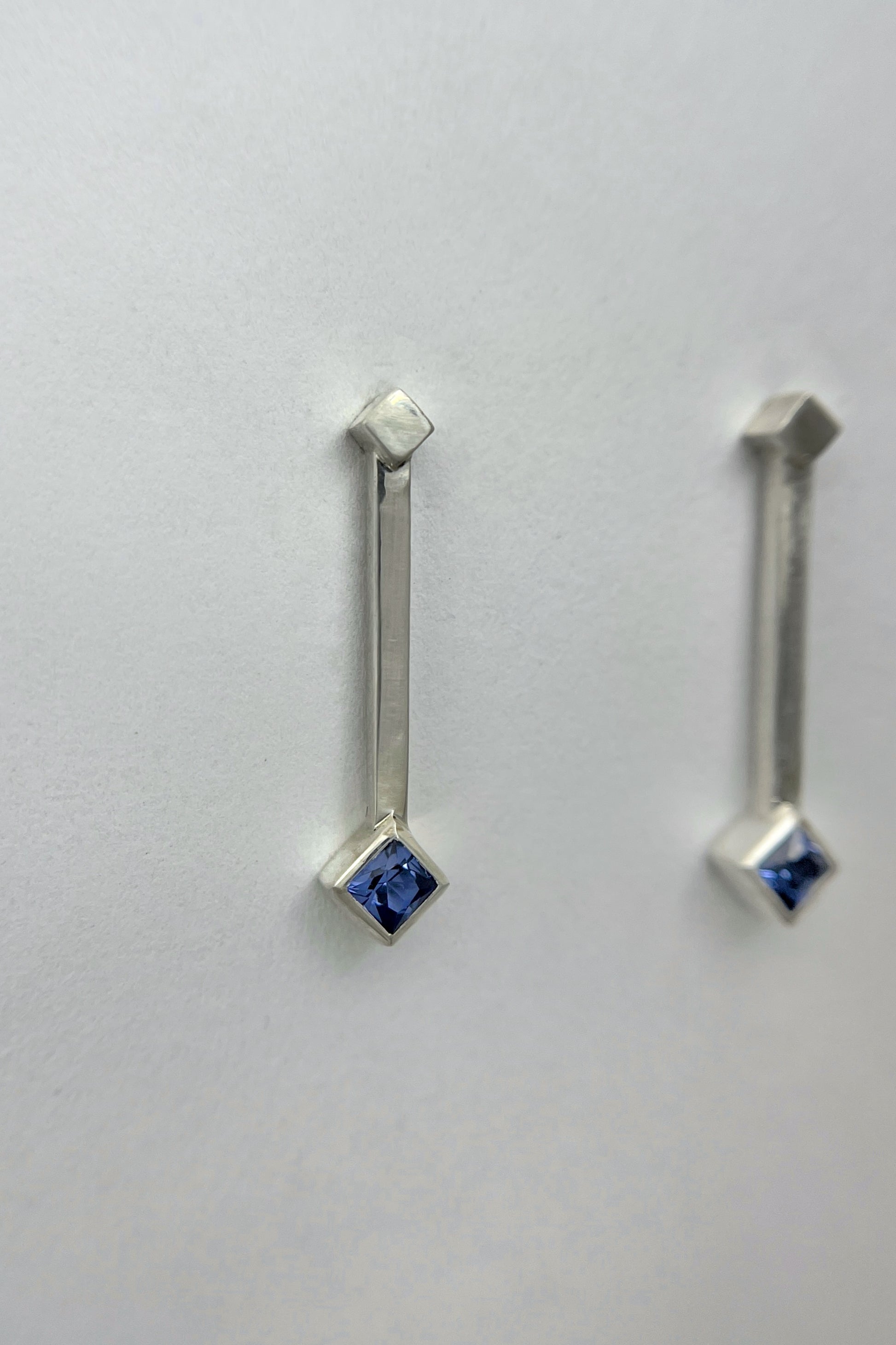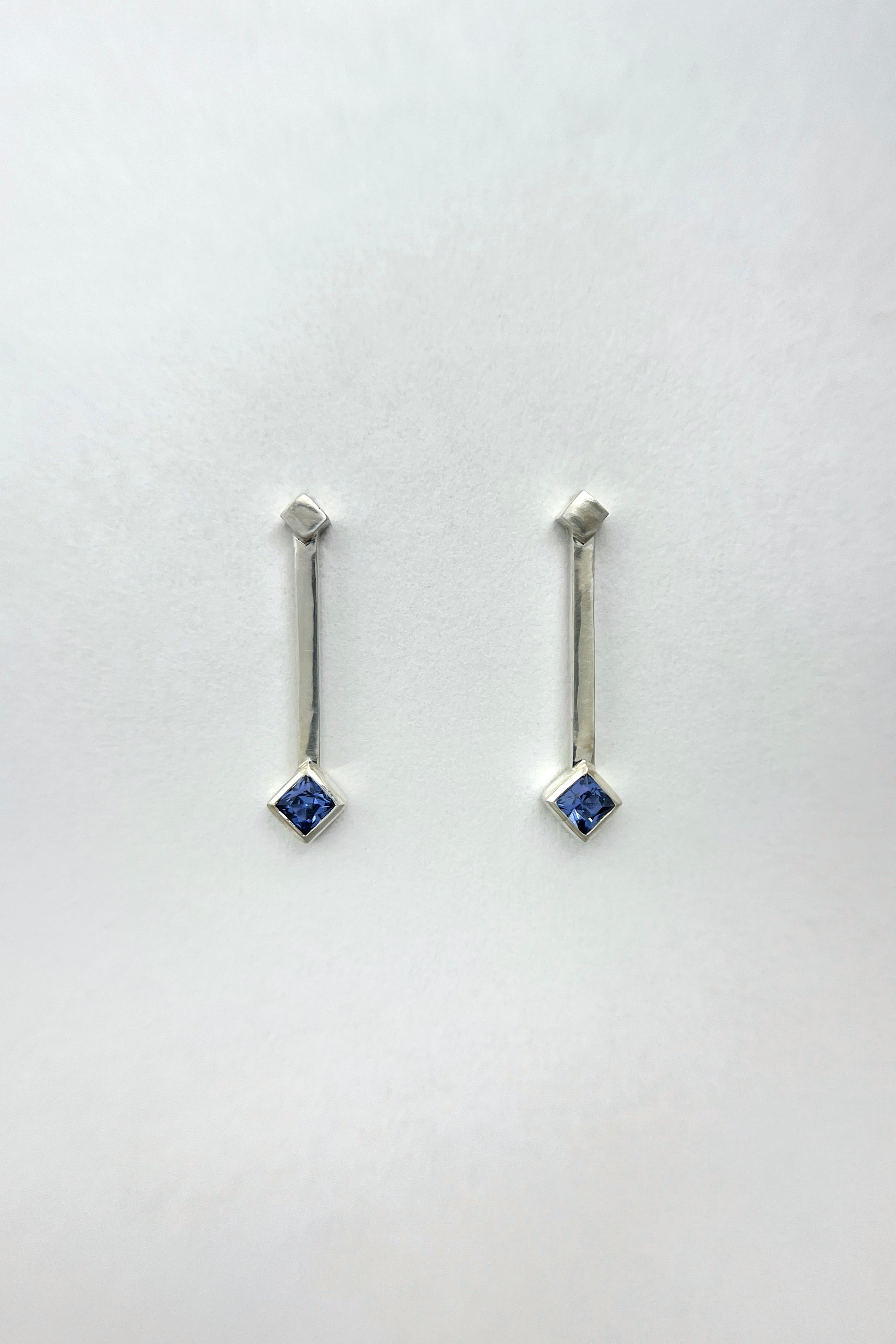 These earrings feature a light blue Ceylon sapphire set as a rotated square at the end of a straight silver drop, with a smaller rotated square accent above. The design is clean and architectural.