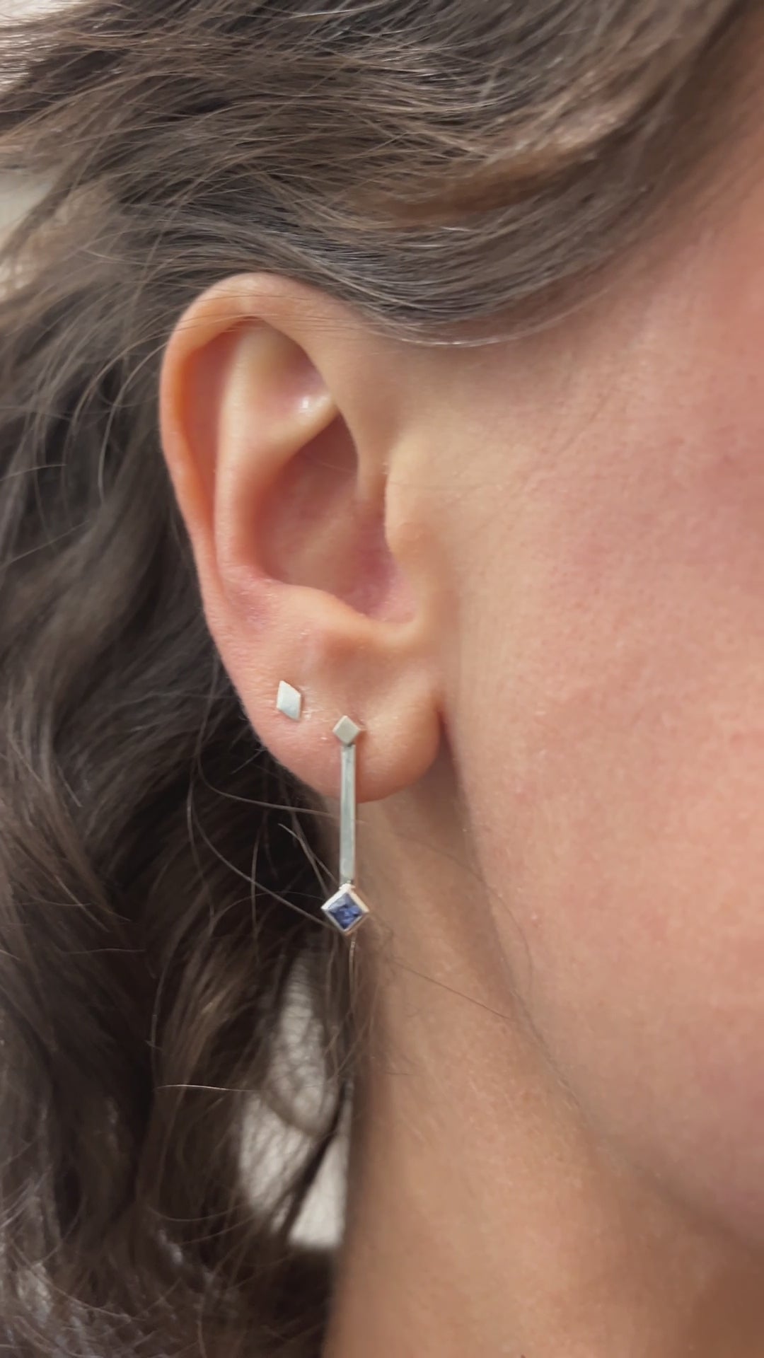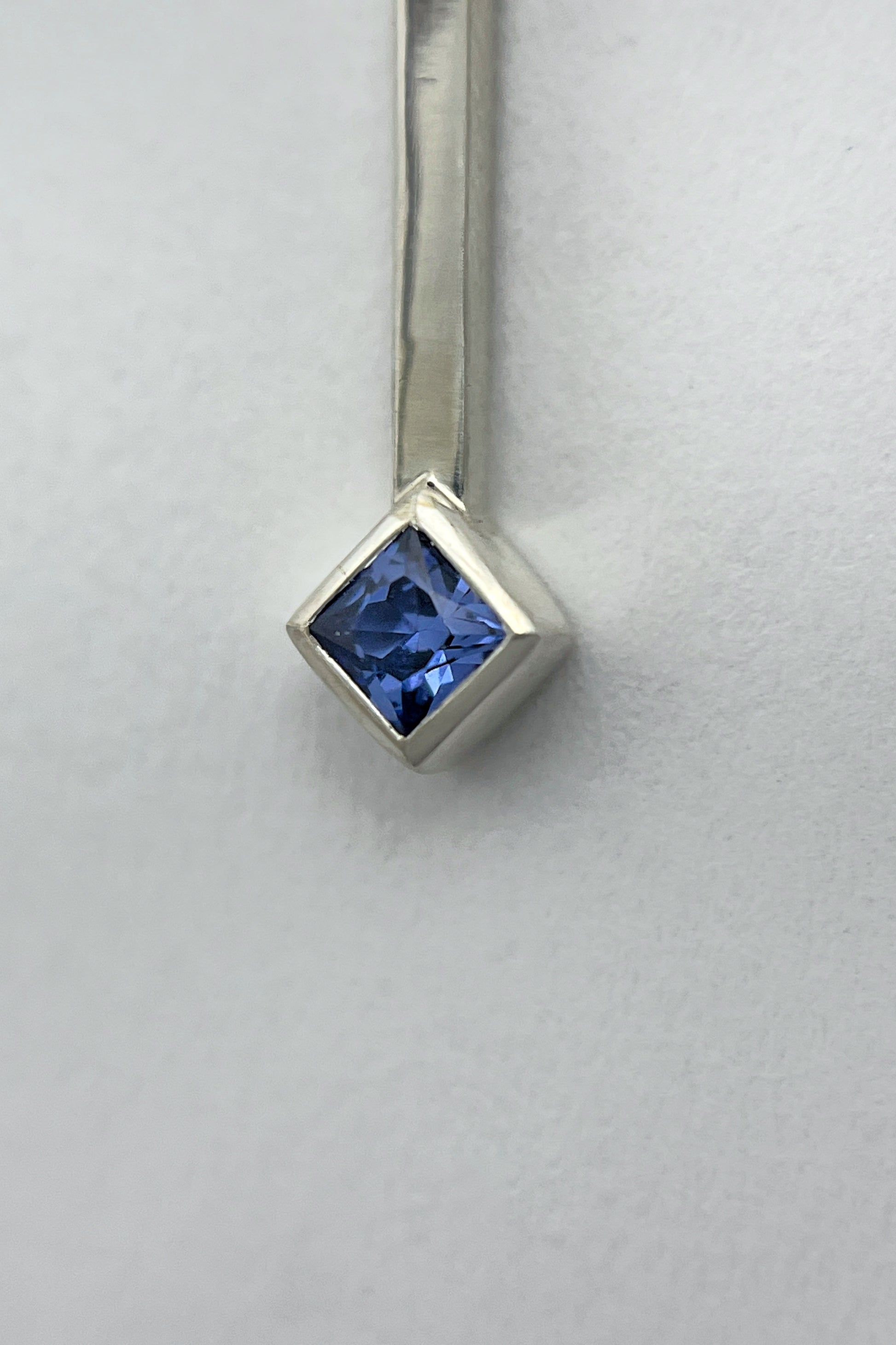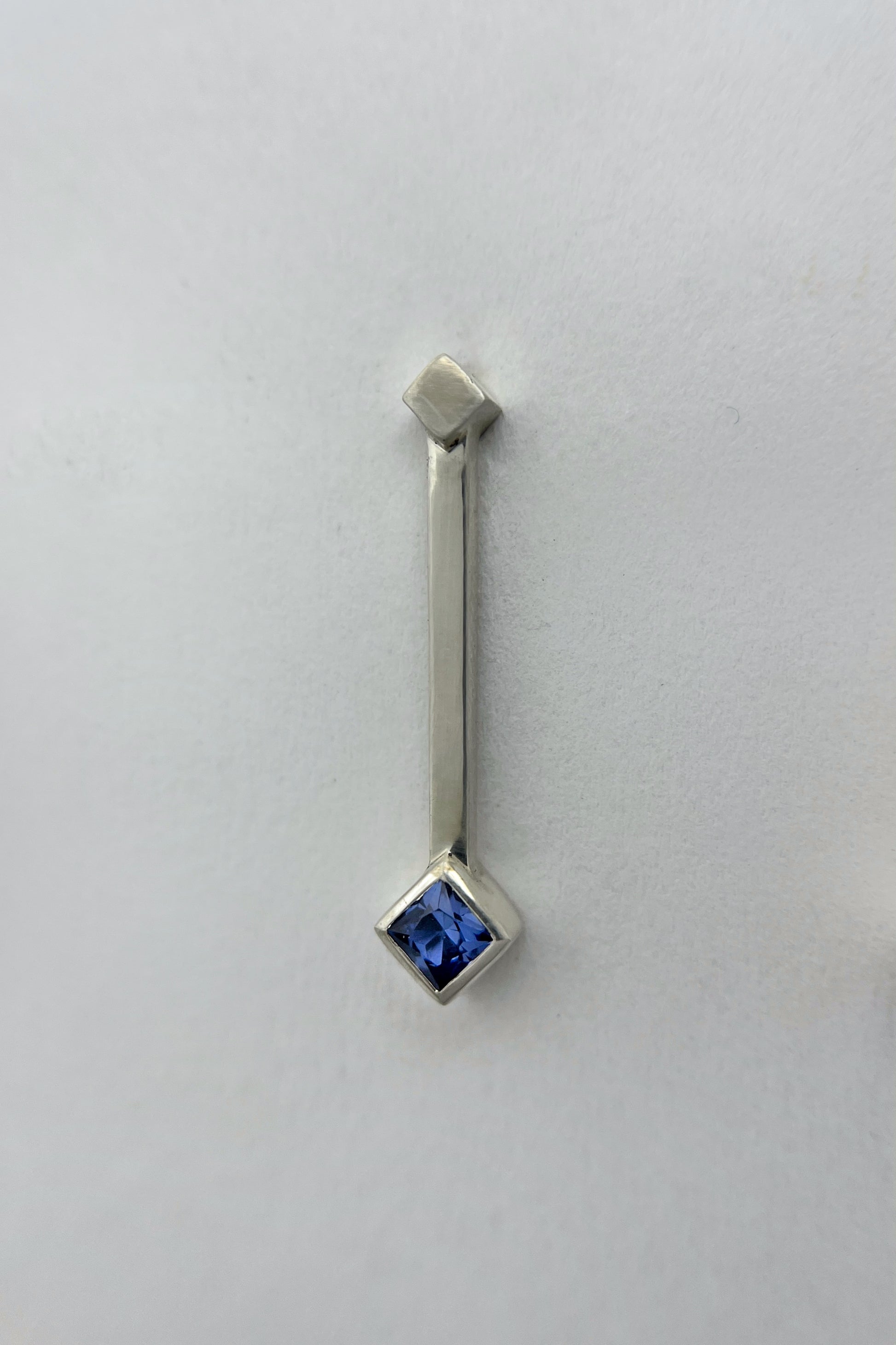 These earrings feature a light blue Ceylon sapphire set as a rotated square at the end of a straight silver drop, with a smaller rotated square accent above. The design is clean and architectural.