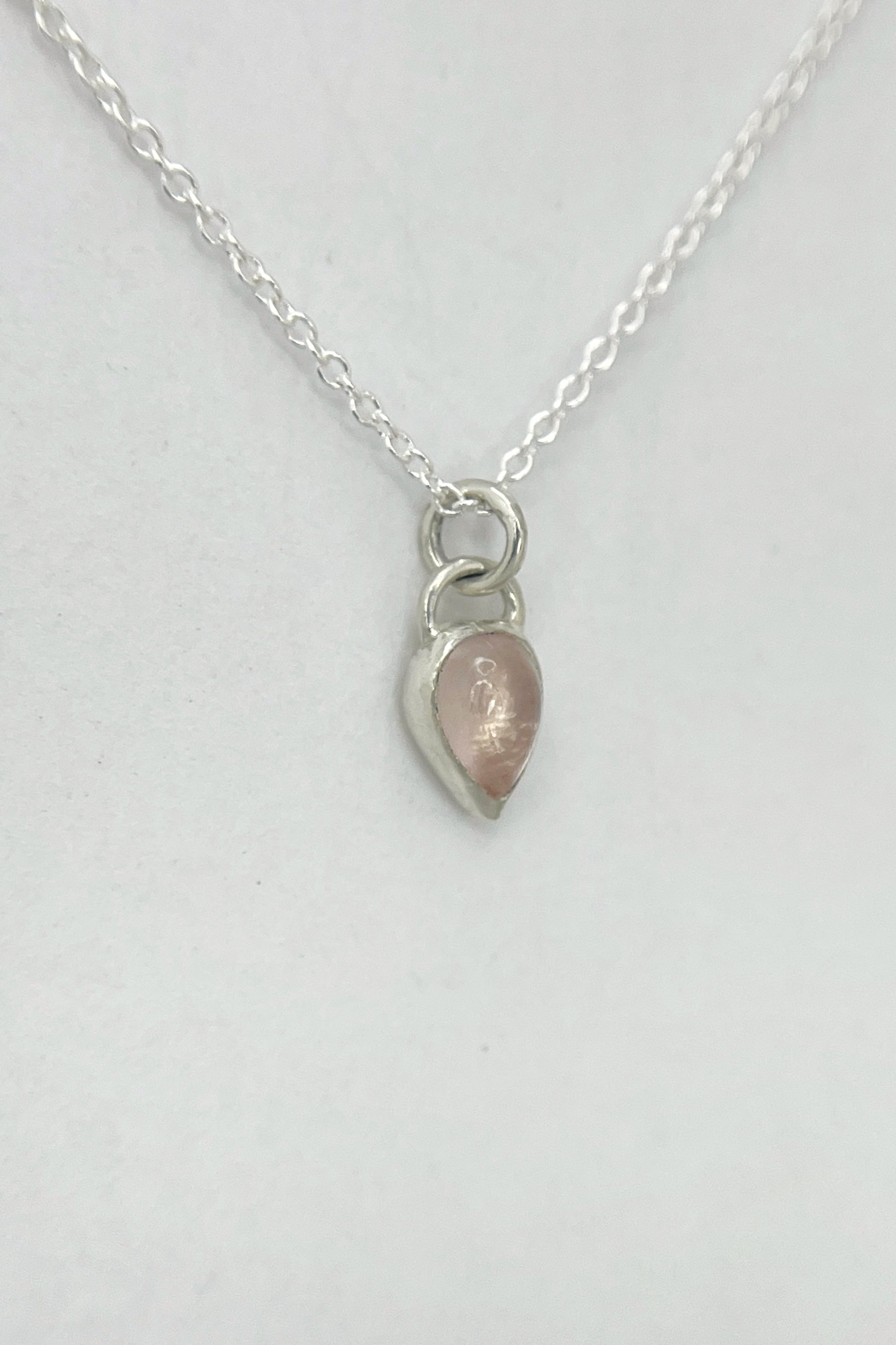 Tiny teardrop necklace features a 6x4mm cabochon rose quartz gemstone. The stone is set simply with a delicate and dainty design to highlight its shape. Perfect for everyday wear or layering.